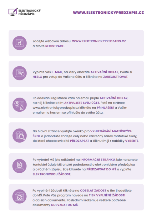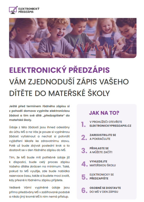 Na webu: www.elektronickypredzapis.cz stačí vyhledat naší mateřskou školu, zaregistrovat se a předzapsat se do ní. Je také možno využít přímý odkaz na informační stránku naší mateřské školy: